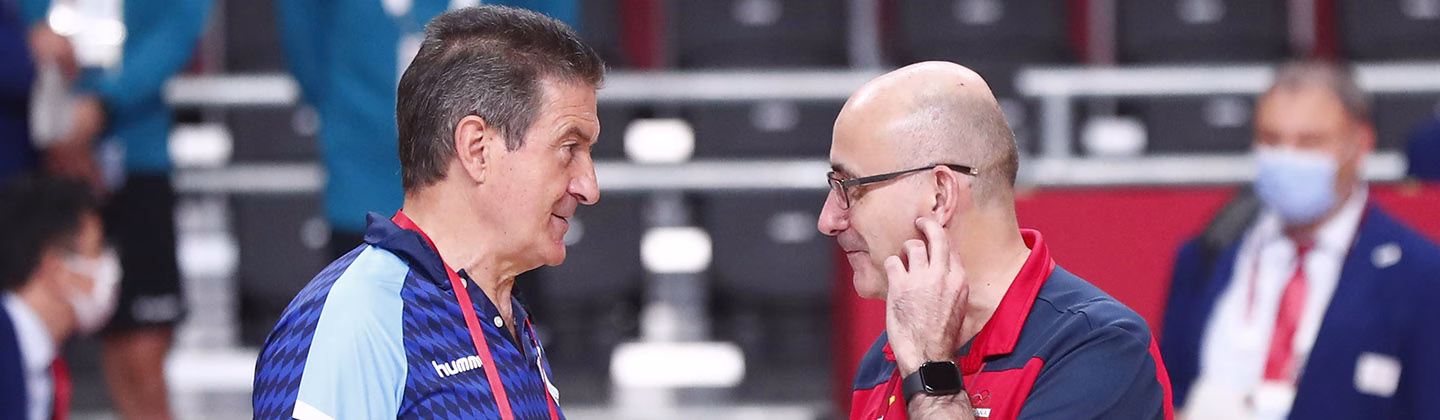 El seleccionador español, Jordi Ribera, y el pivote Adrià Figueras analizan la victoria cosechada esta mañana ante Argentina