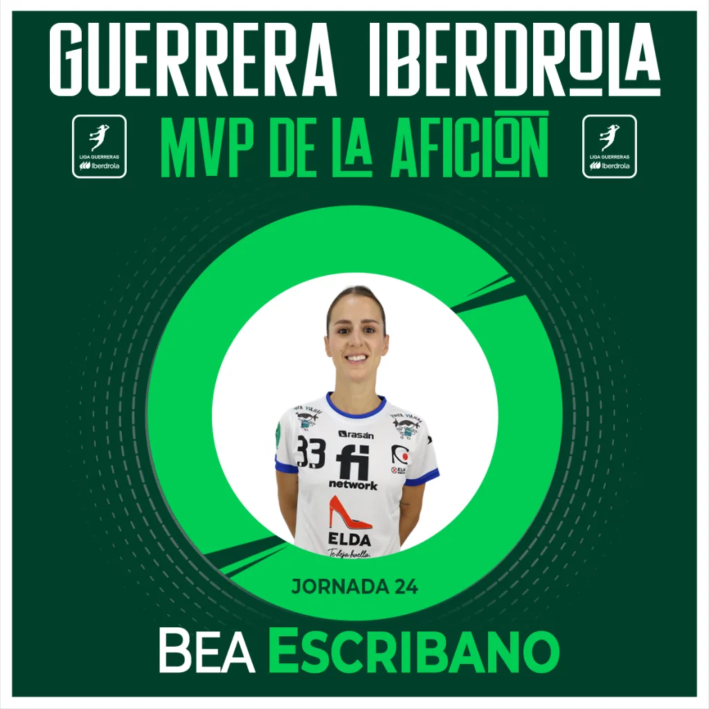 Beatriz Escribano superó en la votación final por el Guerrera Iberdrola de esta Jornada 24 a nombres como los de Paula Fernández (Mecalia Atlético Guardés), Blanca Benítez (Grafometal La Rioja), Elba Álvarez (Super Amara Bera Bera), Nerea Gil (Zuazo Femenino), Lisa Oppedal (Atticgo Elche) y Gabriela Bitolo (Costa del Sol Málaga). Todas ellas habían sido escogidas como las mejores de sus respectivos partidos por los aficionados a través de votos en la red social ‘X’, aunque el Comité de Expertos se ha decantado, finalmente, por la capitana de Elda Prestigio.