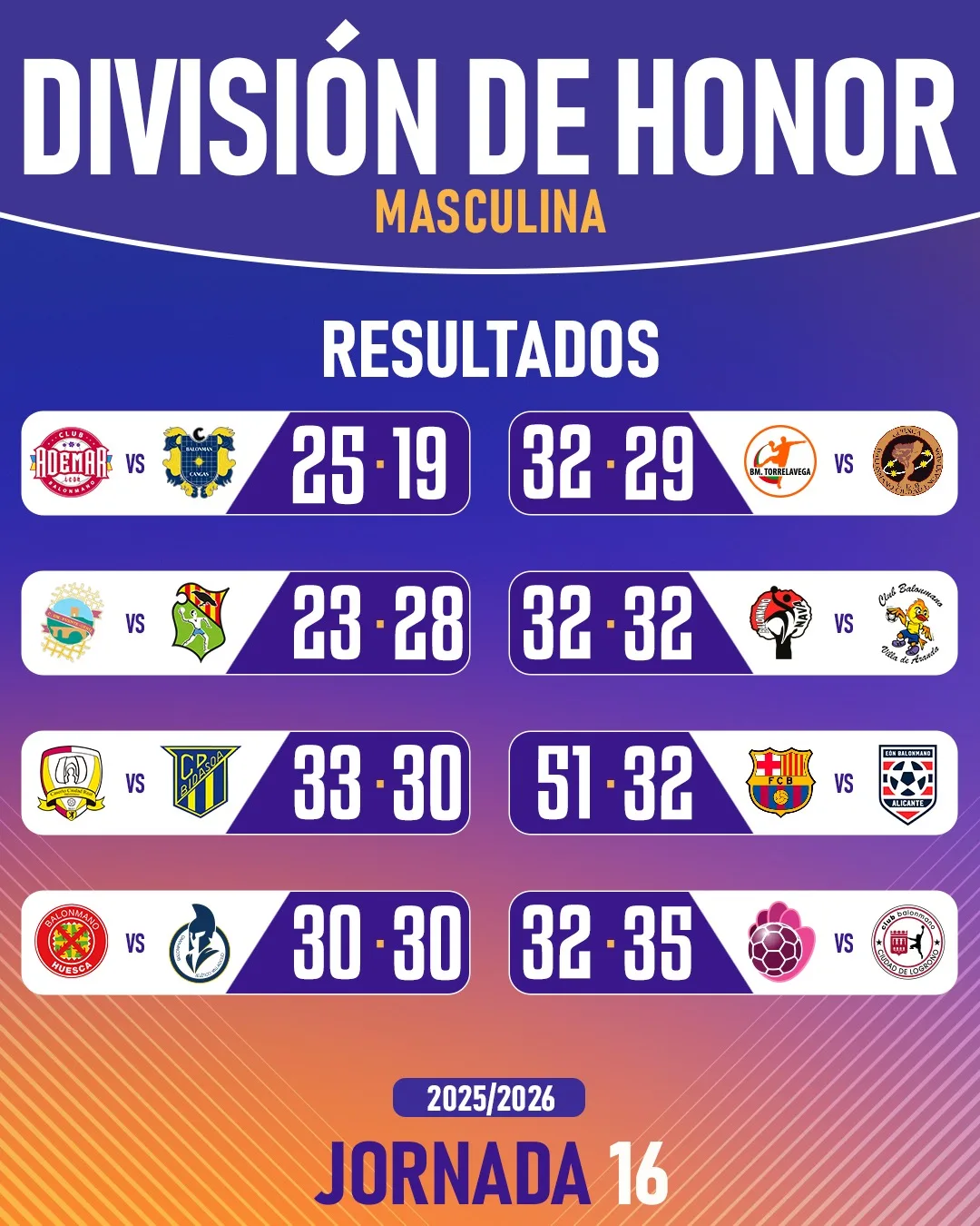 16 equipos buscarán alzarse con el título de campeón de la División de Honor Masculina en la temporada 2025/2026.  El Barça defiende el título de campeón.