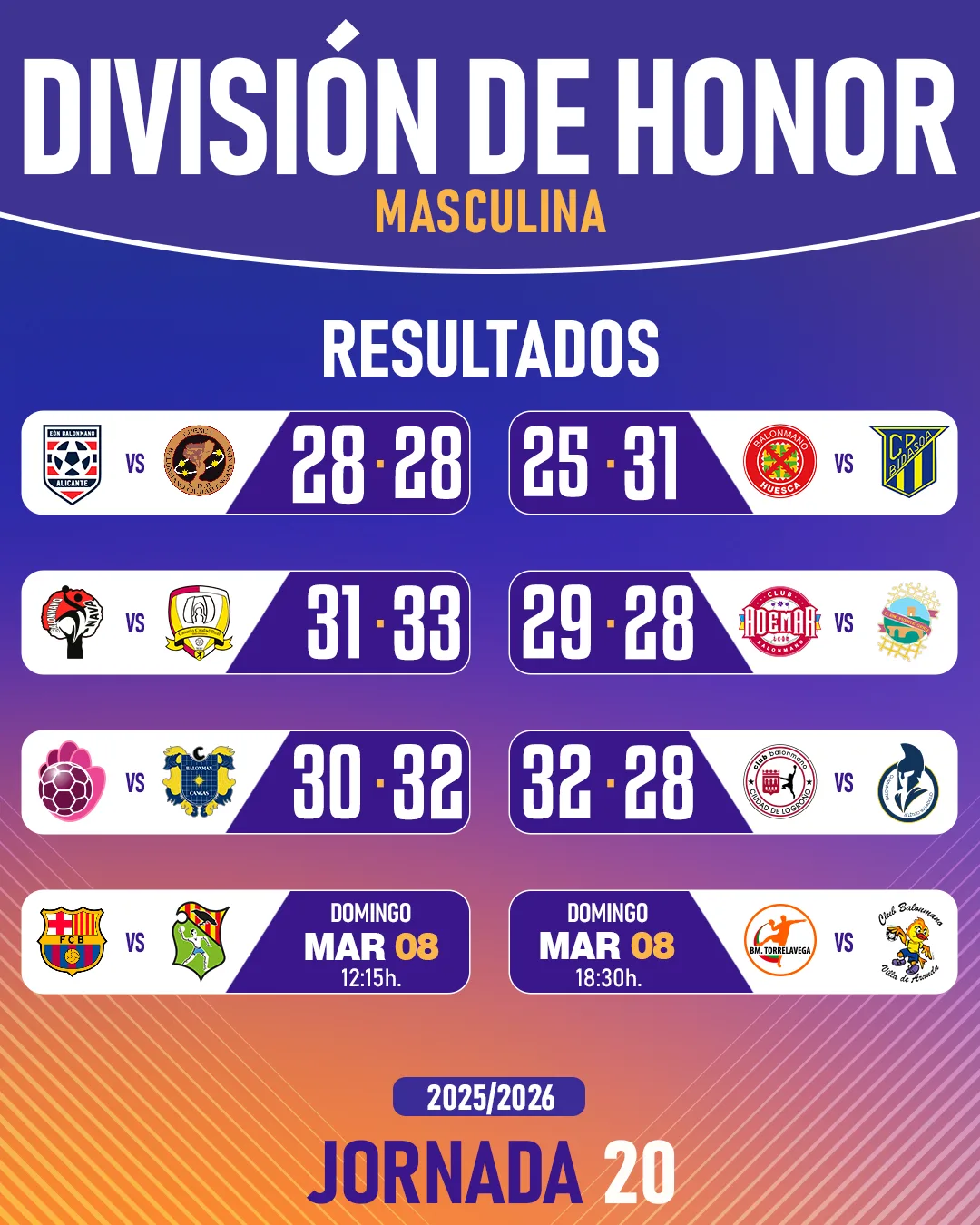 Tras una decimonovena fecha que dejó el tablero de la División de Honor Masculina al rojo vivo, la competición no da tregua. Con el Barça manteniendo su dominio implacable y una zona baja donde cada gol es una batalla por la supervivencia, la Jornada 20 se presenta como un fin de semana de alto voltaje para el balonmano nacional.