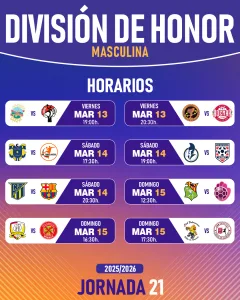 La vigésimo primera jornada de la División de Honor Masculina se presenta como una cita clave en la lucha por los objetivos de la temporada, con varios duelos directos que pueden mover la clasificación.