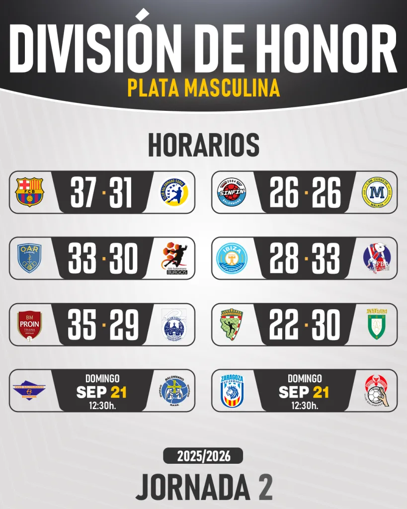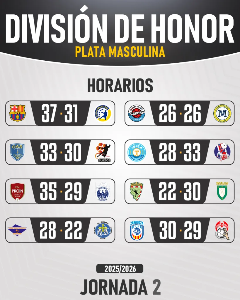 La jornada se abrirá en el Palau Blaugrana, donde el Barça Atlètic recibirá al Club Balonmano Soria. El filial azulgrana llega reforzado no solo por la aportación de la cantera, sino también por su solvente debut liguero: victoria 30-26 ante el Trops Málaga. Destacaron Quim Rocas, reciente subcampeón del mundo con los Hispanos Juveniles, y Manuel Ortega, autores de 7 y 6 goles respectivamente. Muy distinto fue el arranque para el cuadro soriano, que cayó con contundencia (29-40) frente a un Eivissa. El Soria estuvo liderado por un incontenible Marcos Vinicius Assumpçao, máximo goleador de la jornada con 14 tantos.