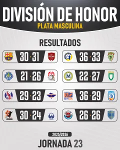 La Jornada 23 de la División de Honor Plata masculina volvió a dejar partidos intensos y resultados importantes en la pelea por el ascenso. Cajasol Sevilla Proin mantiene el liderato con 38 puntos, consolidando su ventaja al frente de la clasificación tras su victoria a domicilio ante el Barça Atlètic por la mínima (30-31).