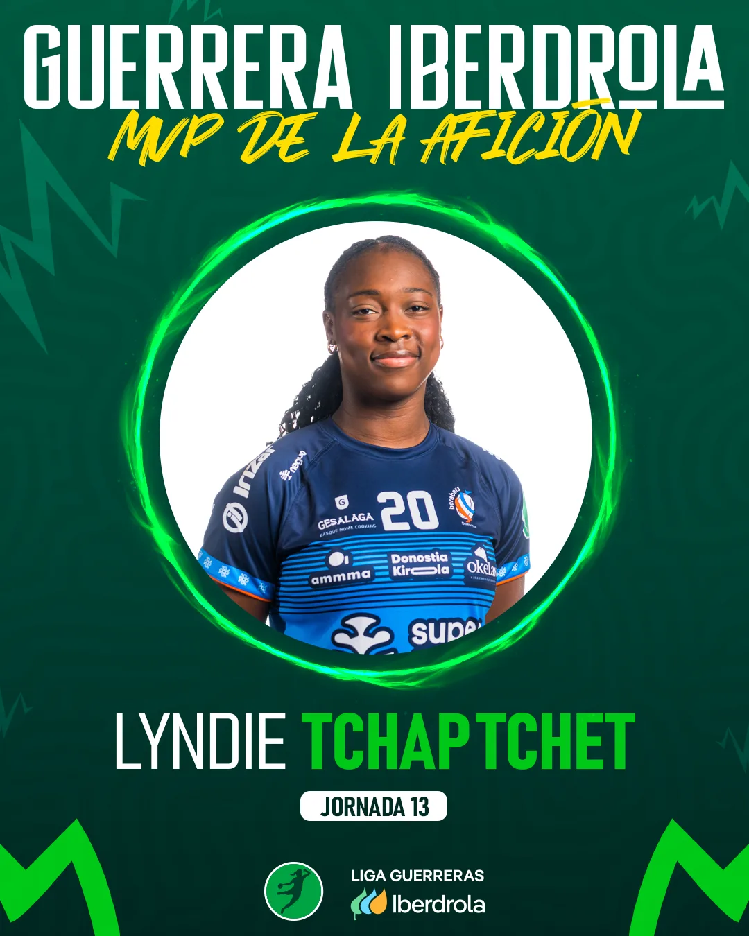 Por su parte, Lyndie Tchaptchet sumó nada más y nada menos que 8 tantos para su equipo este fin de semana ante Caja Rural Aula Valladolid. A pesar de la cómoda victoria de Bera Bera, la pivote ha sido elegida como mejor jugadora de la jornada ante Patri Encinas (Replasa Beti-Onak), Lorena Téllez (Mecalia Atlético Guardés), Paulina Buforn (Conservas Orbe Zendal Porriño), Marta Mera (KH-7 Granollers), Merche Castellanos (Costa del Sol Malaga) y Marie Louis (Zonzamas Plus Car Lanzarote). La joven Guerrera obtiene así su segundo MVP de la temporada.