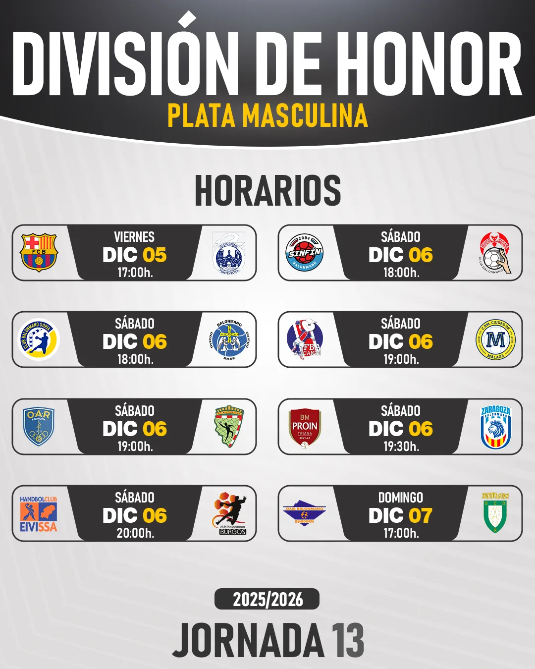 La jornada 13 de la División de Honor Plata masculina llega cargada de duelos decisivos, con un Cajasol Sevilla Proin decidido a defender su liderato ante un Contazara Zaragoza necesitado, y con una zona alta al rojo vivo en la que OAR Coruña, Benidorm, Anaitasuna y Puerto Sagunto buscan no perder el tren del primer puesto. A la tensión por la permanencia —con Soria, Alcobendas y Trops Málaga obligados a reaccionar— se suma el pulso por crecer de aspirantes como Eivissa, Burgos y Barça Atlètic, dibujando un fin de semana de máxima exigencia y oportunidades que pueden marcar el rumbo del campeonato.