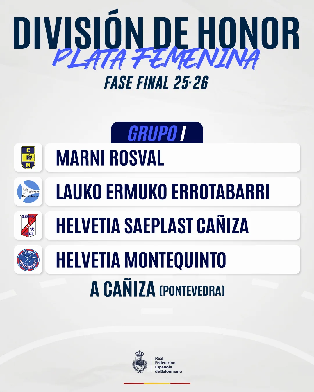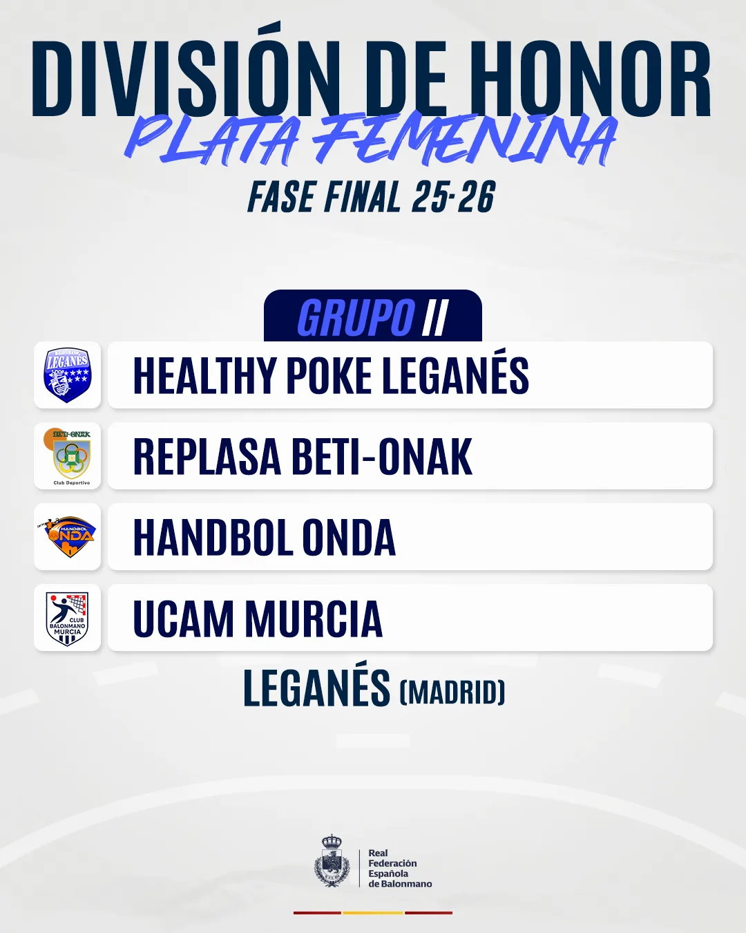 Este lunes 27 de abril de 2026, durante la tarde, se ha celebrado en la sede de la Real Federación Española de Balonmano el sorteo correspondiente a la fase final de la División de Honor Plata Femenina. En él han quedado emparejados los primeros y segundos clasificados de los cuatro grupos que conforman la categoría en la liga regular, y en el que los equipos han sido Healthy Poke BM. Leganés, Lauko Ermuko Errotabarri, BM. Marni Rosval, UCAM BM. Murcia, Helvetia Seaplast Cañiza, Replasa Beti-Onak, H. Onda y Helvetia Montequinto.
