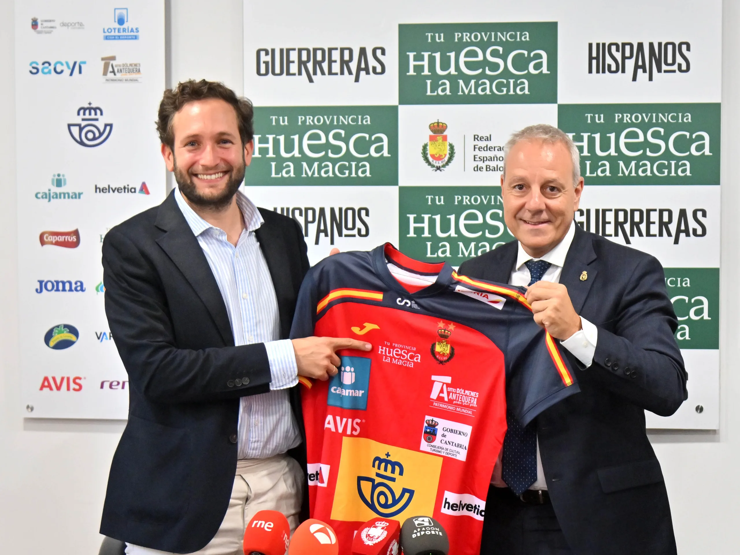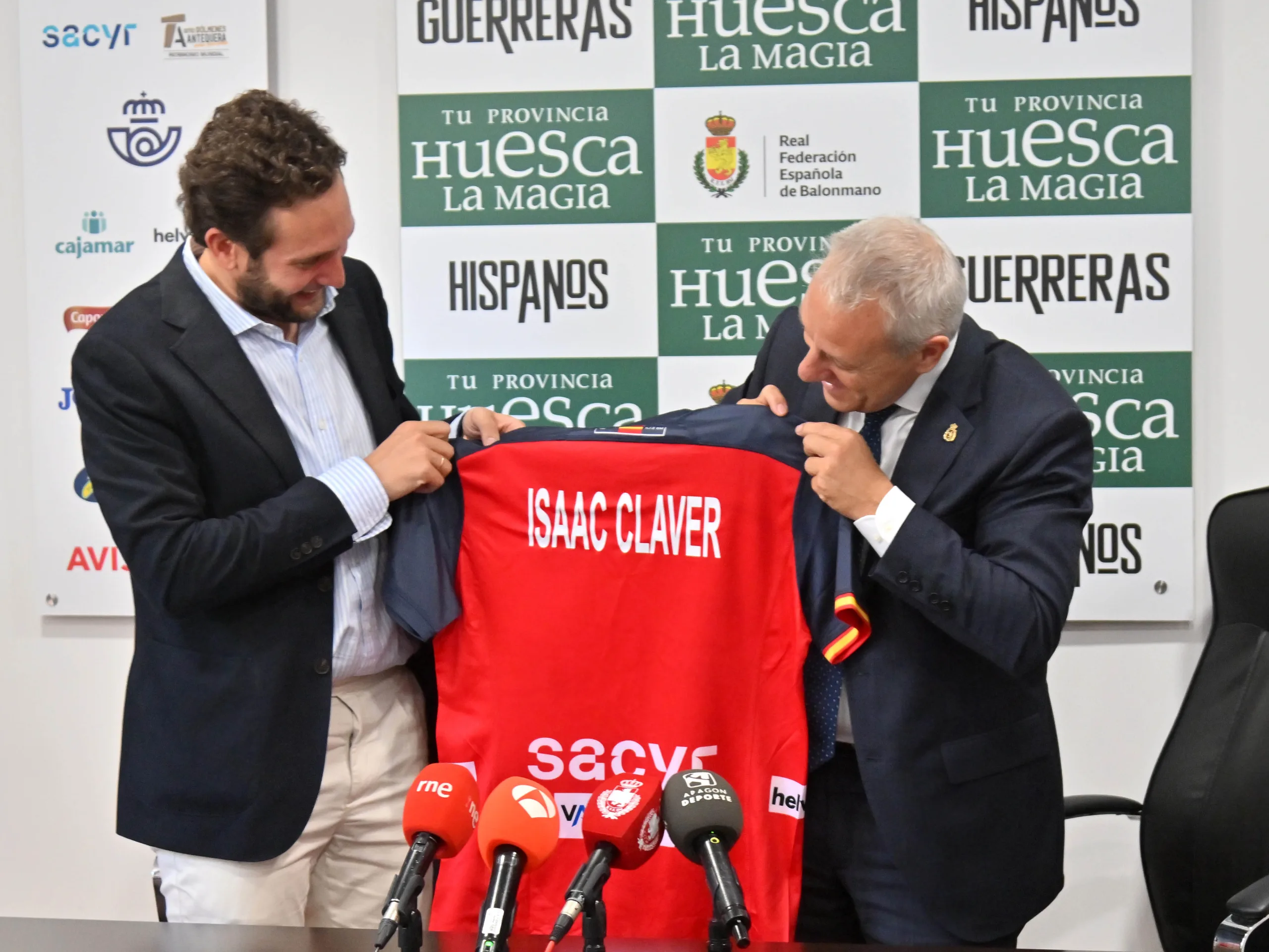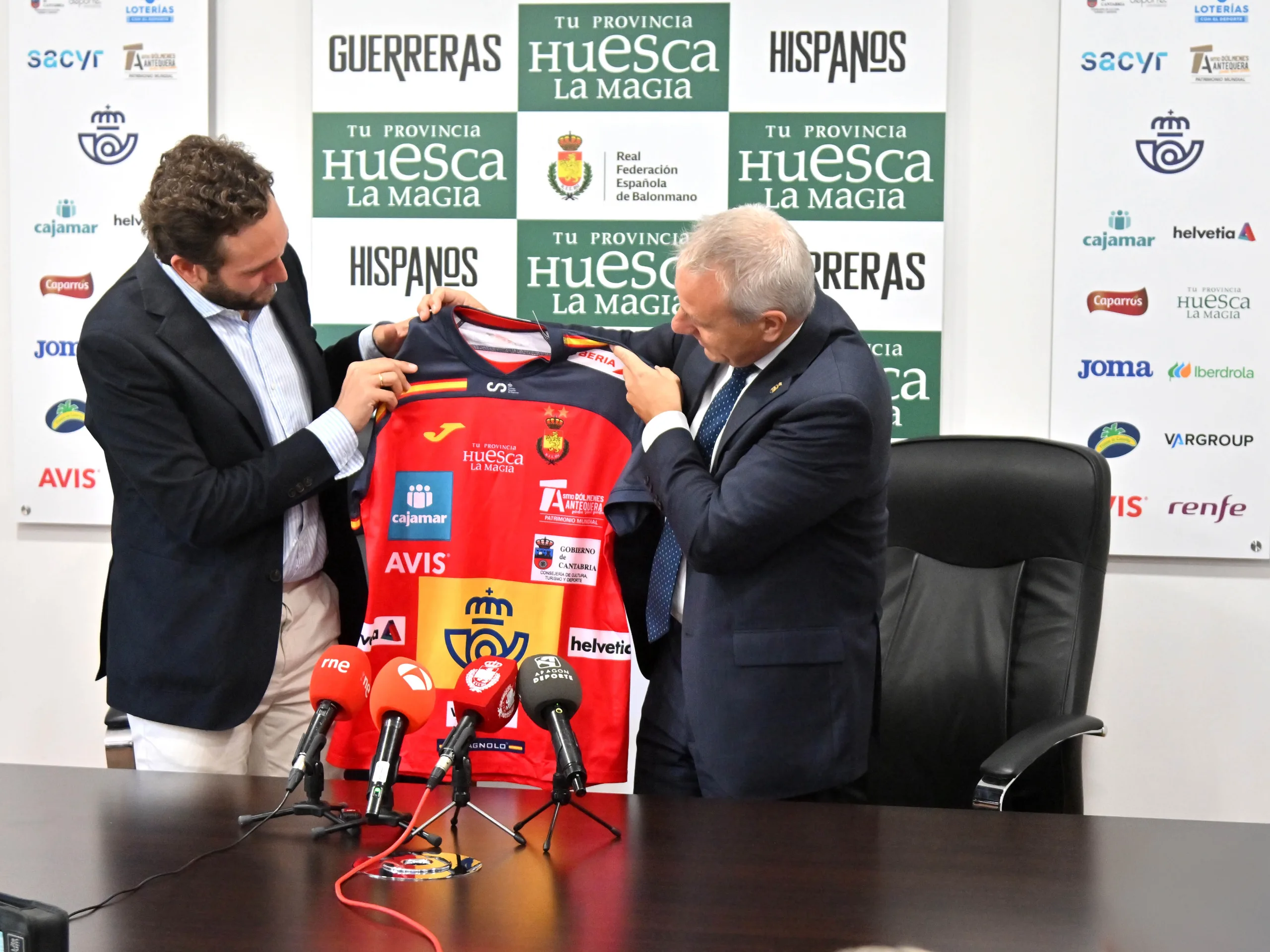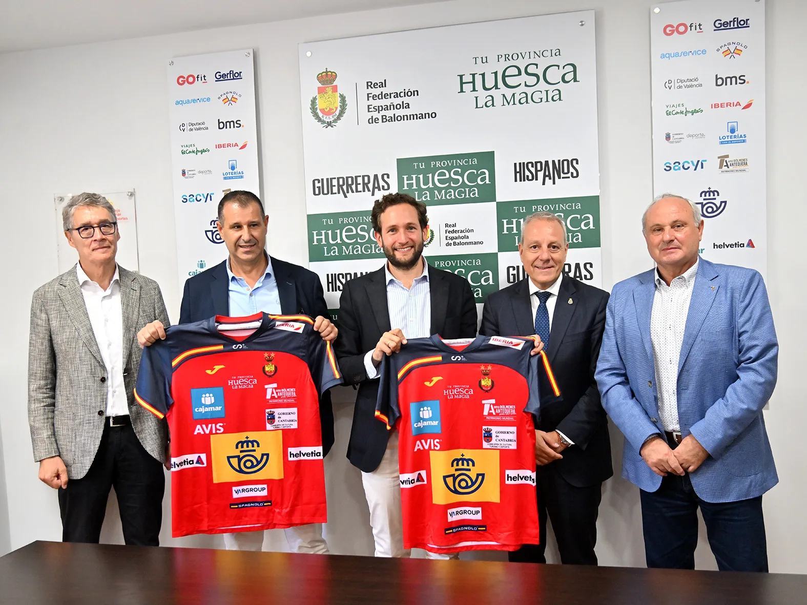 Isaac Claver, presidente de la Diputación Provincial de Huesca, y Francisco Blázquez, presidente de la Real Federación Española de Balonmano, rubricaron el contrato que vincula a ambos organismos, y que asegura la presencia de la imagen corporativa de la Diputación Provincial de Huesca en el frontal de las camisetas de juego de Hispanos y Guerreras. Precisamente, los seleccionadores de ambos combinados españoles, Jordi Ribera y Ambros Martín, han asistido al acto, así como Sergio Serra, diputado delegado de Turismo y responsable de ‘Tu Provincia, Huesca La Magia’; y Juan Carlos Caamaño, vicepresidente de la Real Federación Española de Balonmano y presidente de la Federación Aragonesa de Balonmano.