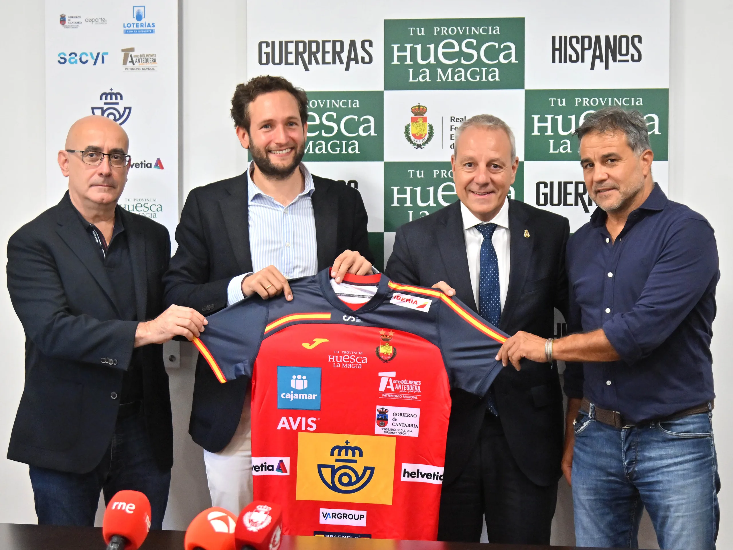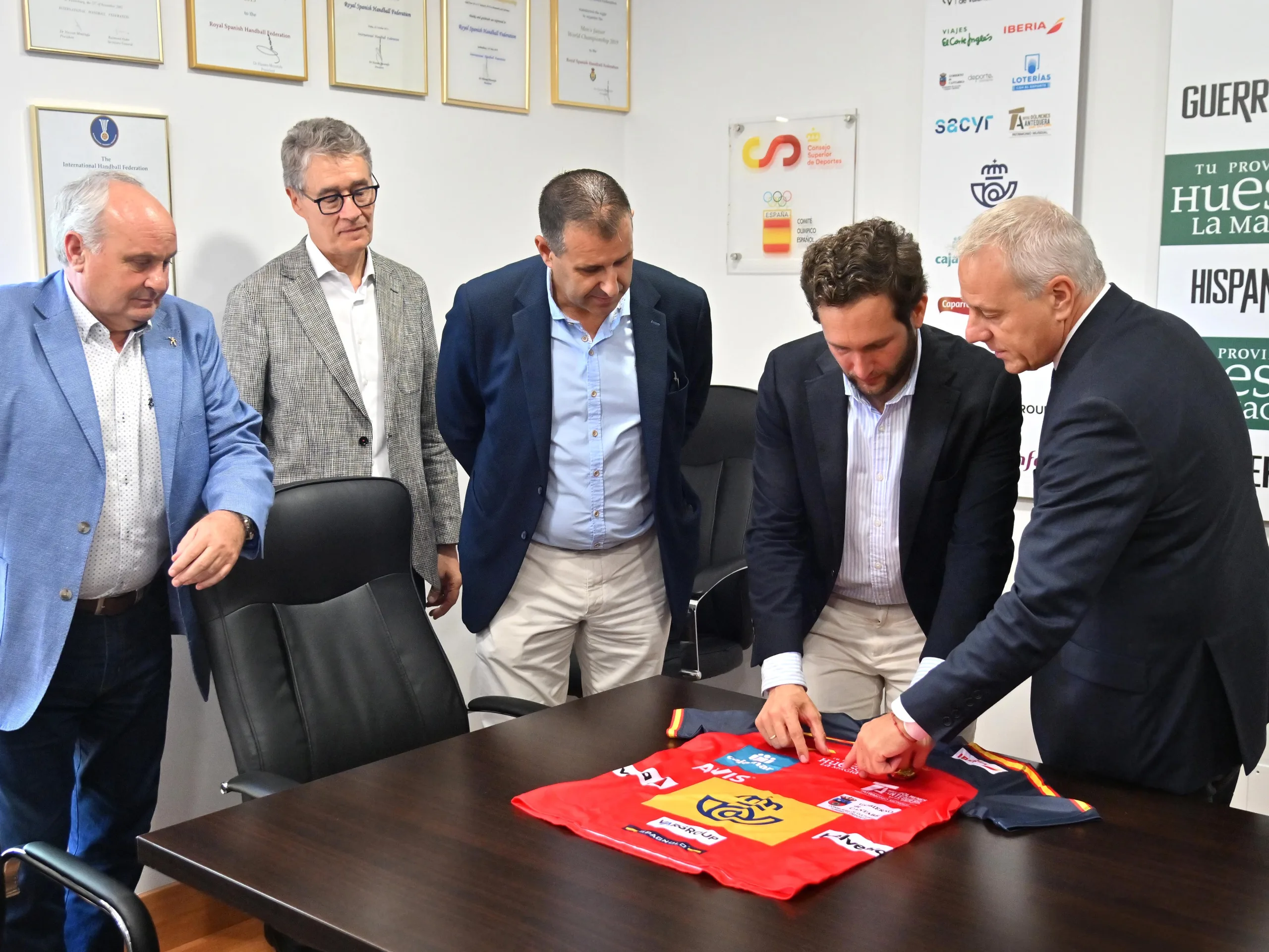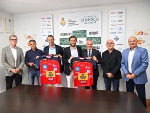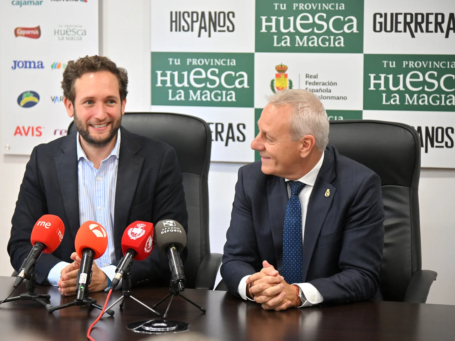 Isaac Claver, presidente de la Diputación Provincial de Huesca, y Francisco Blázquez, presidente de la Real Federación Española de Balonmano, rubricaron el contrato que vincula a ambos organismos, y que asegura la presencia de la imagen corporativa de la Diputación Provincial de Huesca en el frontal de las camisetas de juego de Hispanos y Guerreras. Precisamente, los seleccionadores de ambos combinados españoles, Jordi Ribera y Ambros Martín, han asistido al acto, así como Sergio Serra, diputado delegado de Turismo y responsable de ‘Tu Provincia, Huesca La Magia’; y Juan Carlos Caamaño, vicepresidente de la Real Federación Española de Balonmano y presidente de la Federación Aragonesa de Balonmano.