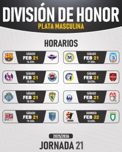 La jornada arrancará este sábado 21 de febrero a las 16:30 h. en la Ciudad Deportiva Joan Gamper. El Barça Atlétic recibirá al Servigroup Benidorm en un duelo de equipos necesitados tras sus recientes derrotas. Los alicantinos, situados en la zona media con dos puntos de ventaja sobre los azulgranas, llegan tras un duro correctivo en la jornada anterior. Si los de Daniel Ariño logran la victoria, igualarían a su rival y podrían escalar hasta tres posiciones si los resultados acompañan.