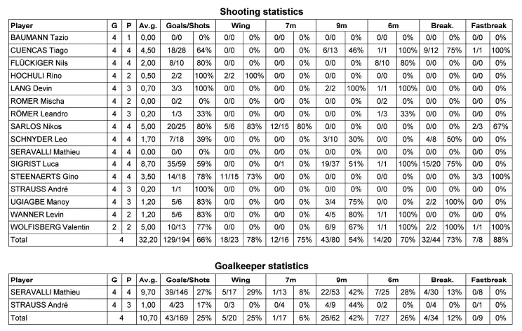 Jugadores a considerar de Suiza. El primero de ellos Luca Sigrist, el central que juega en el HC Kriens, que arrasa con la portería: un gran lanzador de 9 metros y el primero que corre los contrataques, estos le suman 15 goles a su cuenta particular de 35 tantos en el torneo. Desde los 6 metros, Nils Flückiger, pivote del HC Kriens que acumula un 80% de efectividad cuando lanza a portería, una auténtica arma de alto voltaje. Y en portera Mathieu Seravalli, el guardameta que tiene un 27% de efectividad bajo palos, pero que asciende al 42% en los lanzamientos de 9 metros.