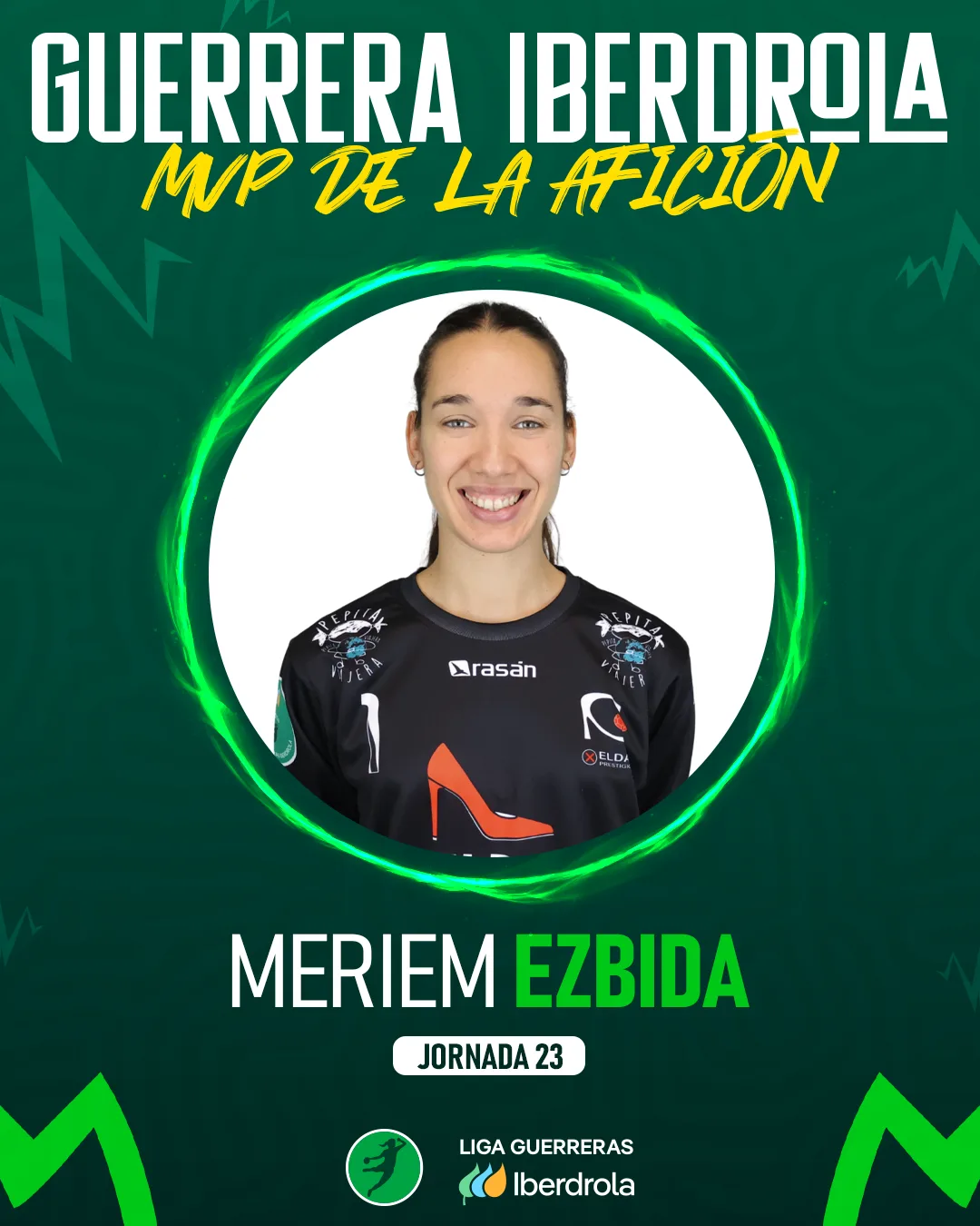 El Comité de Expertos del Área Femenina de la Real Federación Española de Balonmano ha designado a Meriem Ezbida*, portera de Elda Prestigio, como Guerrera Iberdrola de la Jornada 23 en la Liga Guerreras Iberdrola.