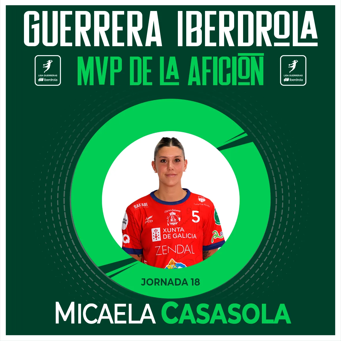 El Comité de Expertos del Área Femenina de la Real Federación Española de Balonmano ha designado a Micaela Casasola, de Conservas Orbe Zendal Porriño, como la Guerrera Iberdrola de la Jornada 18 de la Liga Guerreras Iberdrola. Con ello, se reconoce la gran actuación de Casasola durante el encuentro contra Super Amara Bera Bera, que finalizó con un resultado de 21:22 a favor de las porriñesas.