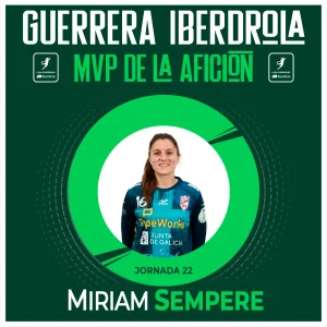 Miriam Sempere superó en la votación final por el Guerrera Iberdrola de esta Jornada 22 a nombres como los de Paula Molano (Elda Prestigio), María O’Mullony (Caja Rural Aula Valladolid), Maitane Etxeberria (Super Amara Bera Bera), Lais Ferreira (Zuazo Femenino), Silvia Navarro (Rocasa Gran Canaria) y Micaela Casasola (Conservas Orbe Zendal Porriño). Todas ellas habían sido escogidas como las mejores de sus respectivos partidos por los aficionados a través de votos en la red social ‘X’, aunque el Comité de Expertos se ha decantado, finalmente, por la guardameta de Mecalia Atlético Guardés.