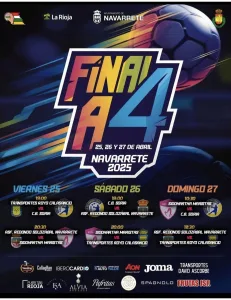Con motivo de la celebración del 40 aniversario de la Federación Riojana de Balonmano (1985-2025), se celebrará los días 25, 26 y 27 de abril la Final A4 de Segunda Nacional en el Polideportivo María Ramírez de Navarrete. Esta fase final, en formato de sector, reunirá a Transportes Royo Calasancio, C.B. Soria, ASF. Redondo Solozábal Navarrete y Siddhartha Maristas. Francisco V. Blázquez, presidente de la Real Federación Española de Balonmano, acudirá al evento para celebrar este momento histórico de la Federación Riojana.