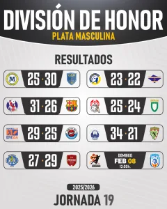 La decimonovena jornada de la División de Honor Plata Masculina, ha dejado duelos de altísima intensidad y marcadores muy ajustados en la lucha por el ascenso. Uno de los encuentros más destacados fue la sólida victoria de la Fundación Agustinos Alicante por 31-26 ante el Barça Atlètic, con una actuación estelar de David Quiles, máximo anotador con 12 tantos. Por su parte, el Club Balonmano Soria logró imponerse por la mínima al BM Servigroup Benidorm (23-22) en un final agónico en el Pabellón San Andrés.