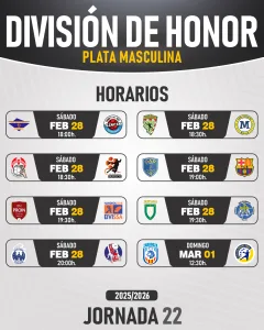 La Jornada 22 de División de Honor Plata comienza a ver la luz al final del túnel, solo quedan 9 jornadas para que termine la liga regular. Grandes duelos que harán del fin de semana uno para recordar. Duelos de iguales, tanto en la parte baja como alta de la clasificación serán los protagonistas de la competición. Servigroup Benidorm alzará el telón el sábado por dos puntos esenciales para escalar posiciones. El Fertiberia Puerto Sagunto contra UBU San Pablo Brugos será un aspirante a partido de la jornada, en disputa con el encuentro de Contazara Zaragoza ante Balonmano Soria que no dejará a nadie indiferente.
