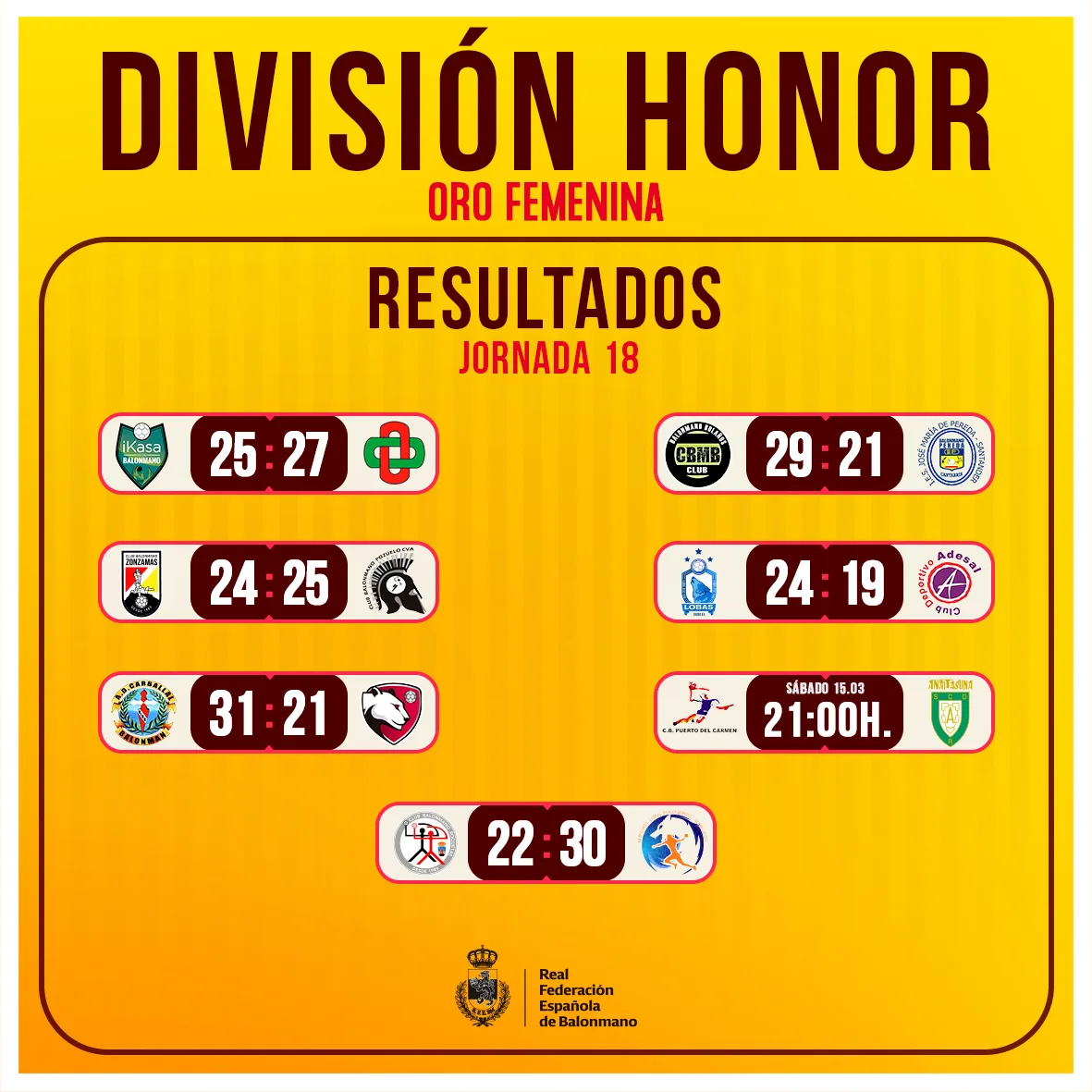 También nos encontramos un duelo directo por la permanencia en la División de Honor Oro Femenina en la zona baja de la tabla. Y es que Agrinova Costa de Almería Roquetas y Grupo USA H. Mislata, último y penúltimo, se enfrentaban para confirmar ese cambio de posiciones con la victoria del equipo valenciano por 22:30. Lejos está todavía la salvación, pues marca el corte un Solimusic Events Carballal que también ganó en esta jornada, 31:21, al Caja Rural Cleba.