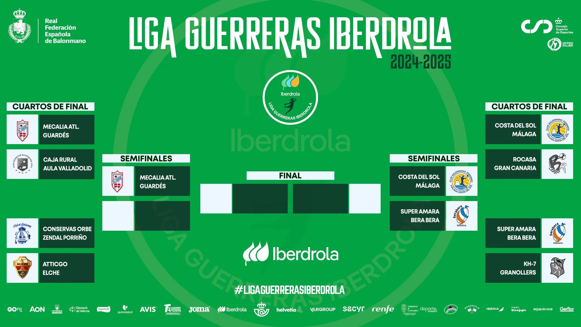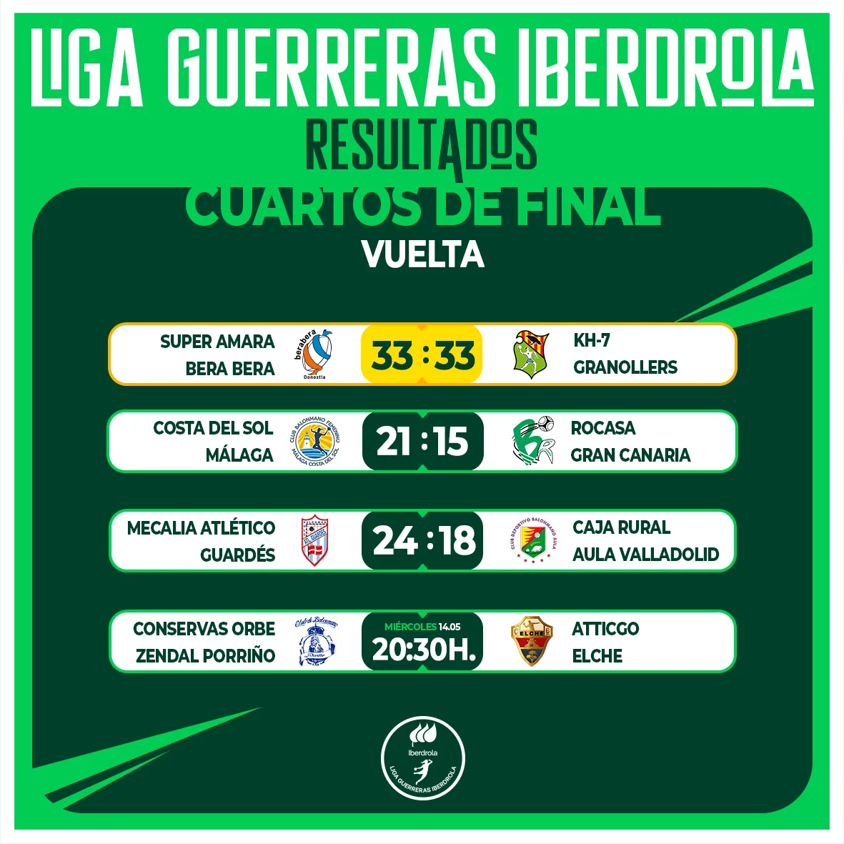 Los cuartos de final de la Liga Guerreras Iberdrola han dejado eliminatorias igualadísimas y que han brillado con luz propia con partidazos. Tres equipos aguardan ya en semifinales, Super Amara Bera Bera y Costa del Sol Málaga por un lado; y Mecalia Atlético Guardés por otro, esperando ya rival del duelo aplazado entre Conservas Orbe Zendal Porriño y AtticGo Elche.